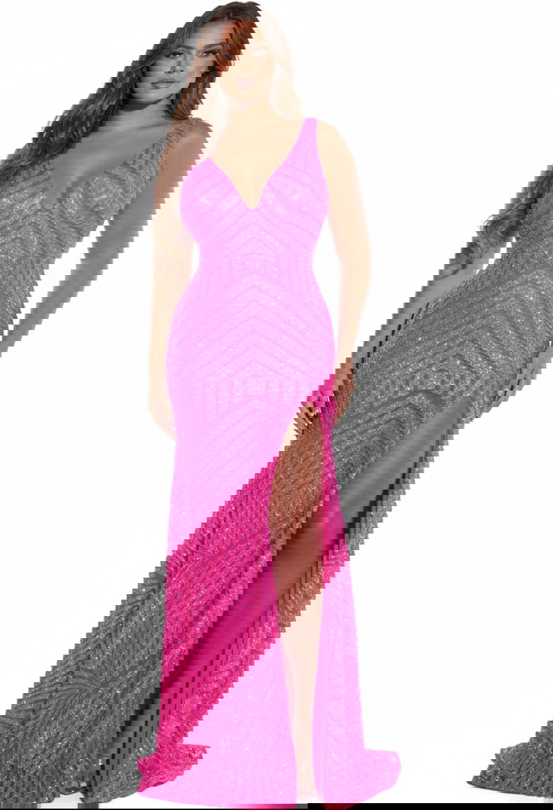 Dazzle in this full-length gown featuring an alluring V-neckline that elegantly frames the face. The sleeveless design adds a modern touch, perfect for evening occasions. A high slit adds a dramatic flair, revealing a silhouette that hugs the body beautifully before cascading down to the floor. The gown is adorned with intricate sequin patterns, catching the light with every movement and ensuring you stand out in any crowd.