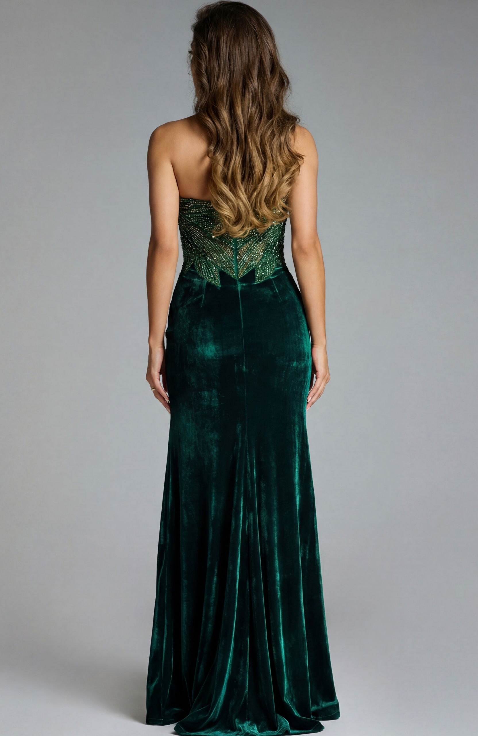 The Jovani 43711 dress in dark green features a captivating silhouette with a fitted bodice adorned with intricate beading. This floor-length gown includes a strapless neckline and a high slit, adding a touch of allure to its elegant design. The skirt flows gracefully from the waist, crafted from plush velvet that accentuates the rich green color. Perfect for evening events, this dress combines glamour and sophistication effortlessly.