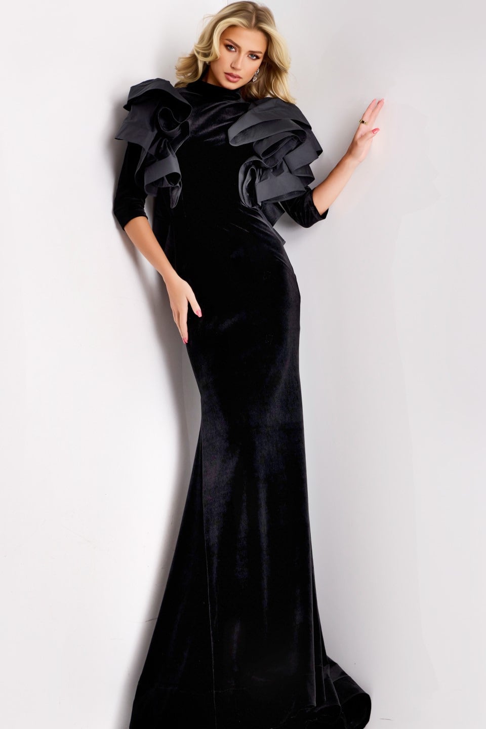 This stunning velvet gown features a floor-length hem and a sleek silhouette that gracefully contours the body. The design showcases a high neckline with exquisite ruffled details cascading over the shoulders, creating a dramatic and elegant effect. The 3/4 sleeves complete the sophisticated look, making it perfect for formal occasions.