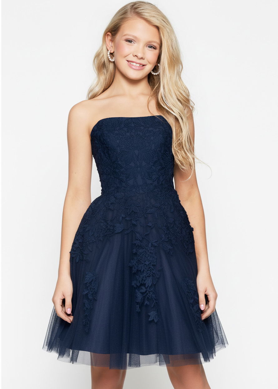 Turn heads at any event with this stunning strapless A-line dress. The short-length dress features intricate floral appliques that add a touch of elegance and whimsy. Crafted from delicate tulle fabric, this dress offers a comfortable fit and a flattering silhouette. Whether in ivory, red, or light blue, this dress is perfect for any special occasion, making you feel both beautiful and confident.