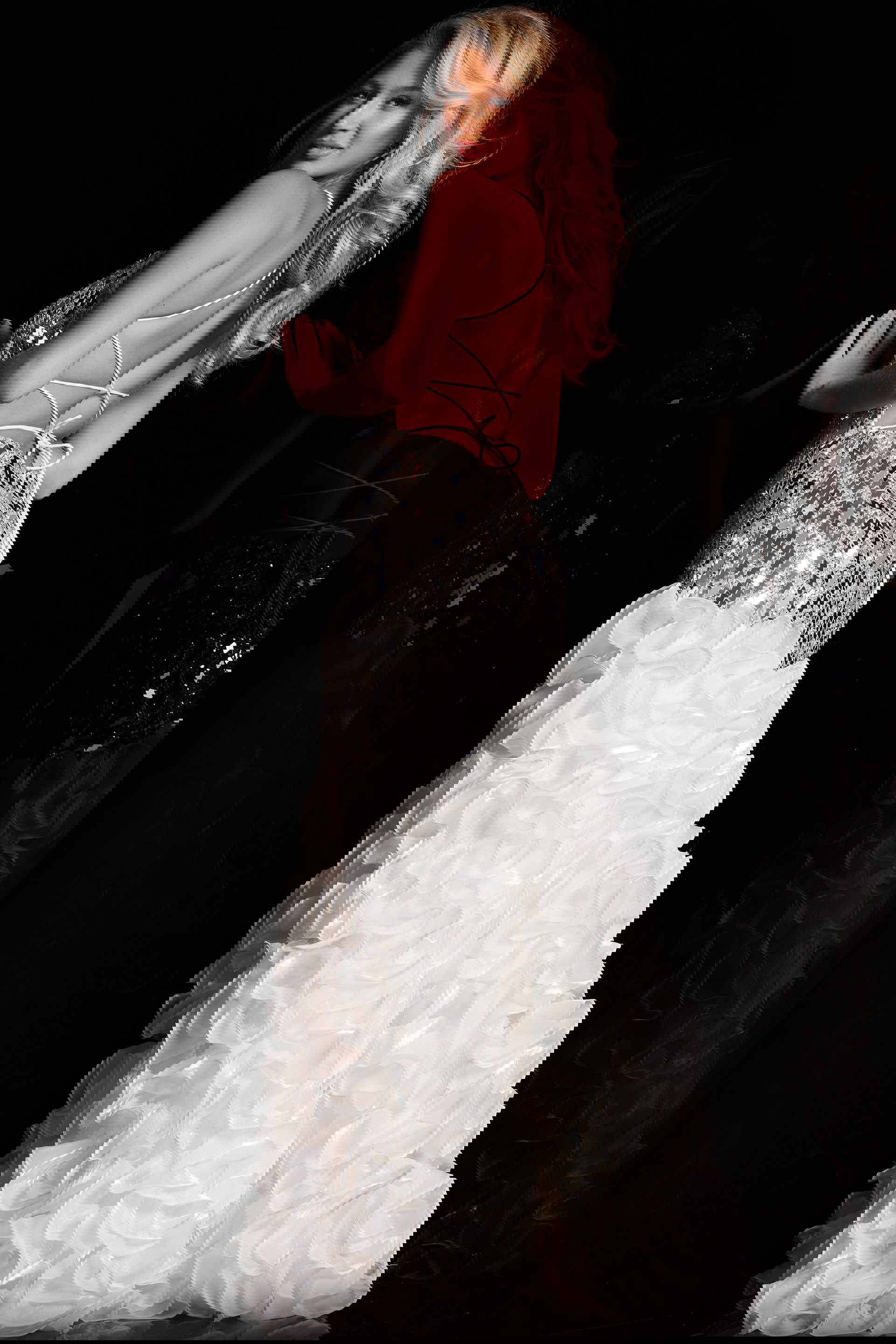 The cut glass embellished bodice adds a touch of opulence and sparkle to the ensemble, creating a dazzling focal point. The flare ruffle asymmetric bottom with a slit adds drama and movement, giving the gown a modern and chic edge.
