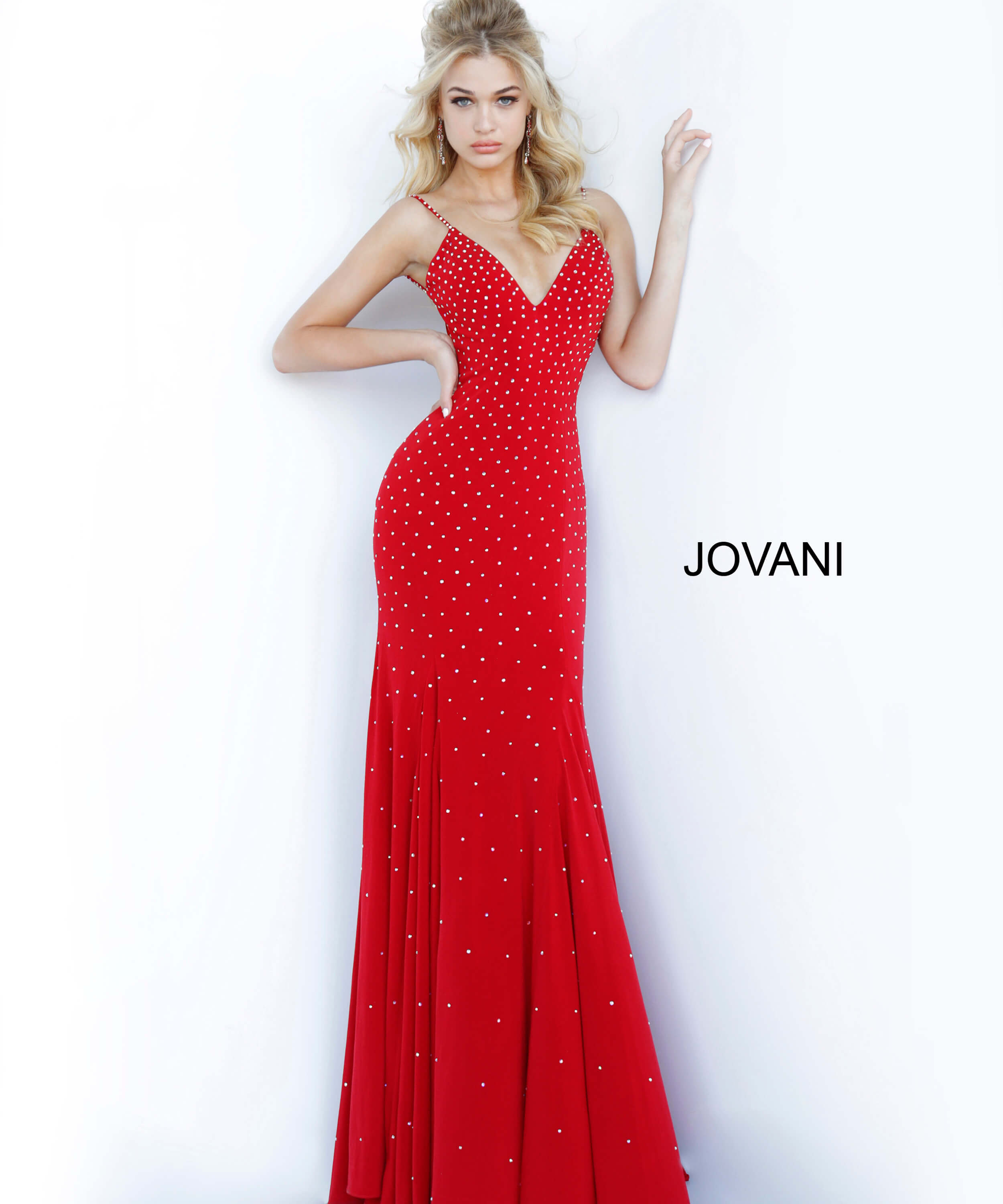 This jersey embellished gown fits any and every body type. With a godet flared end and open back, you’ll be feeling confident and sexy at your next prom and pageant. The AB stoning and v neckline add a modern feel to this style. Available in 7 colors including, red, black, and light blue.