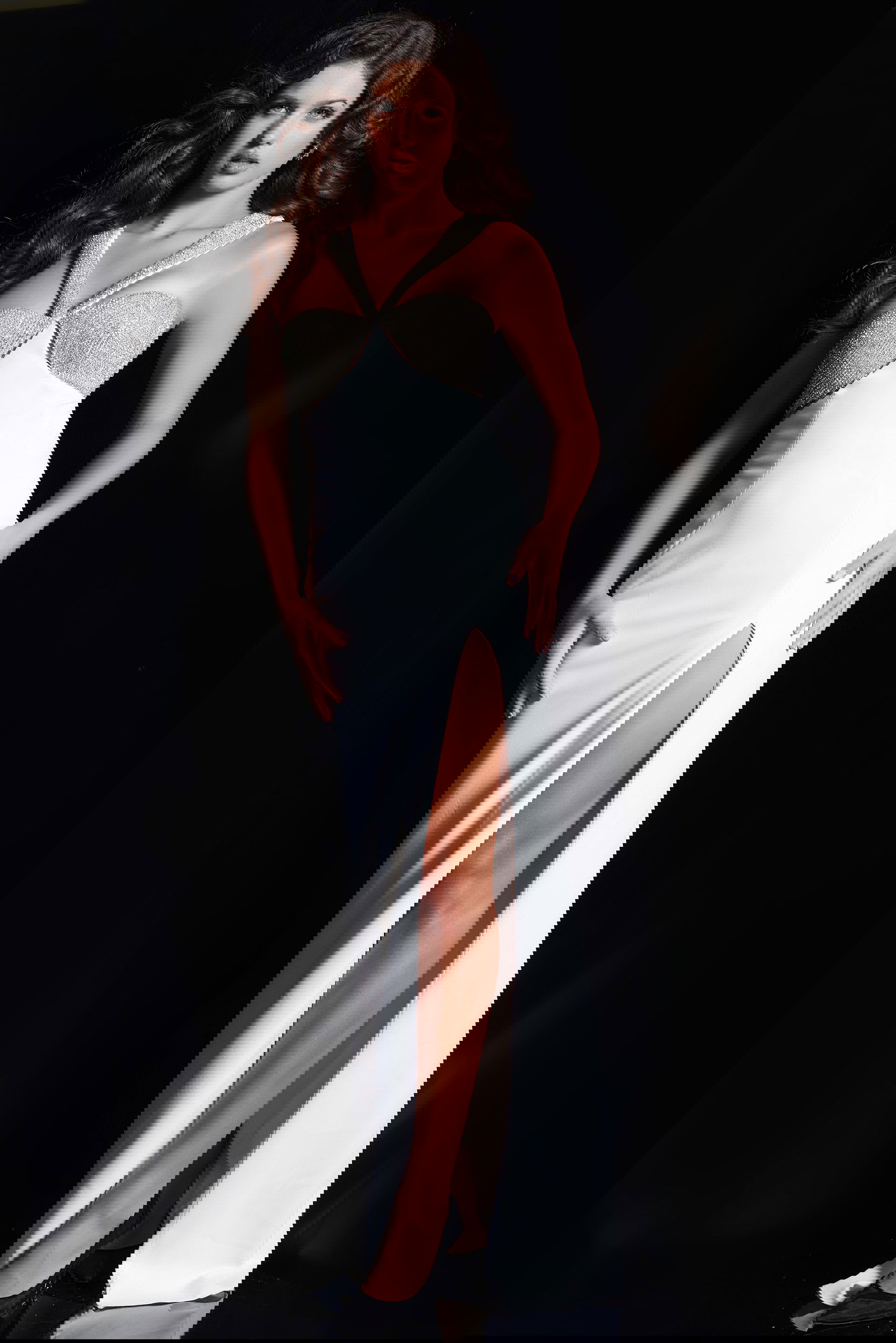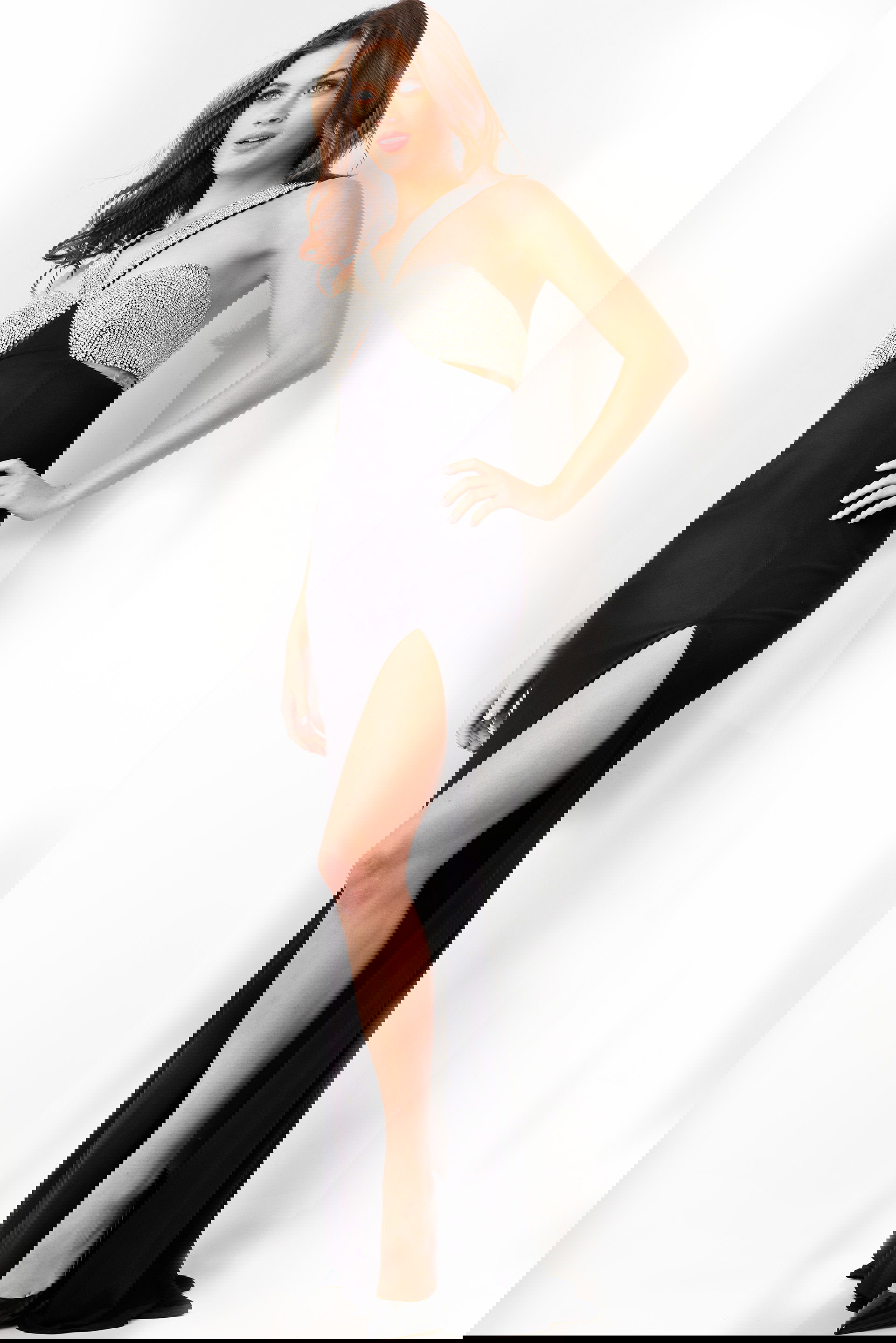 The gown features a high slit and a sweeping train, adding a touch of drama and elegance to the ensemble. The crystal embellished bust and straps provide a dazzling and opulent focal point, creating a sense of luxury and glamour. The illusion under bust cutout adds a modern and alluring touch, enhancing the overall design.