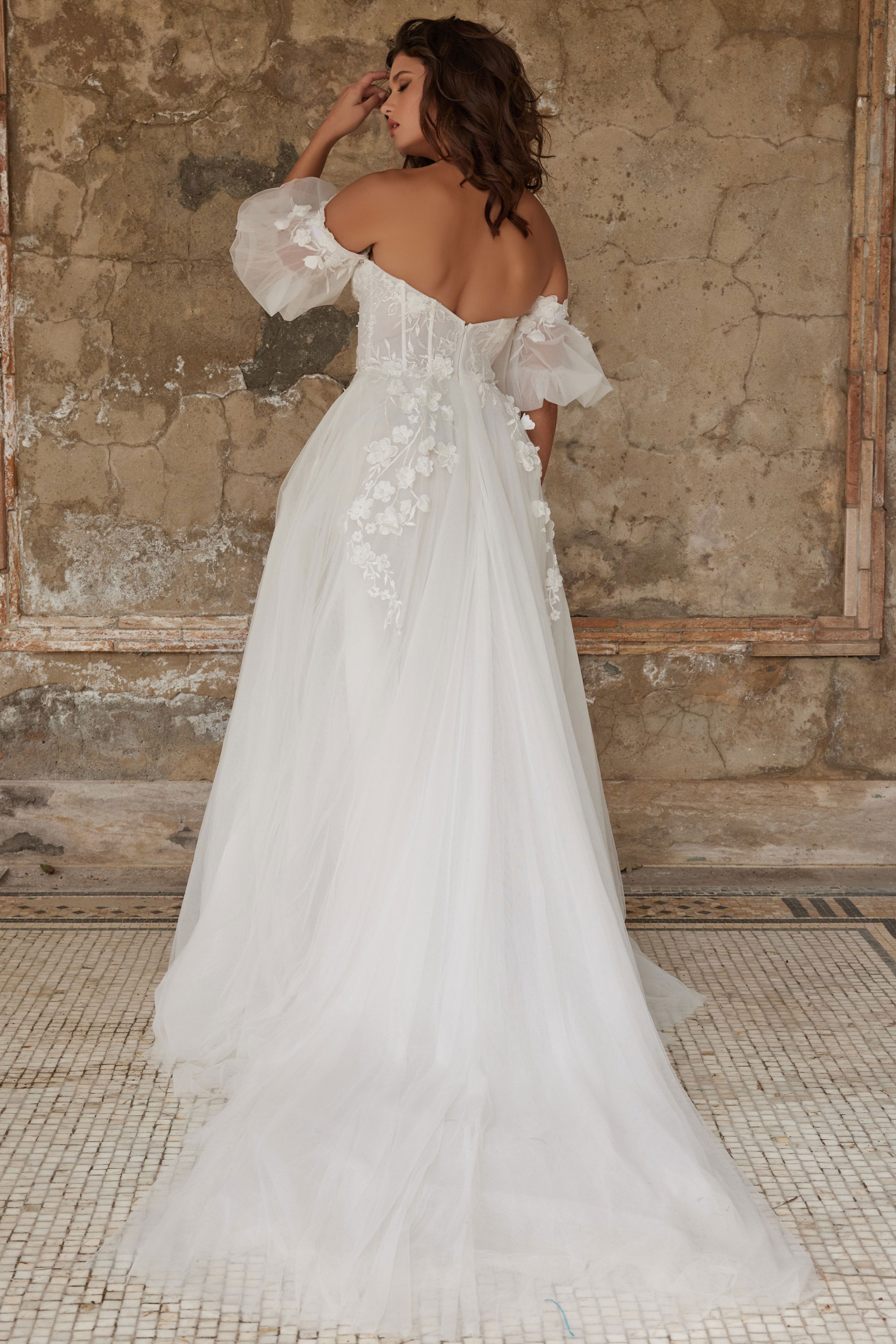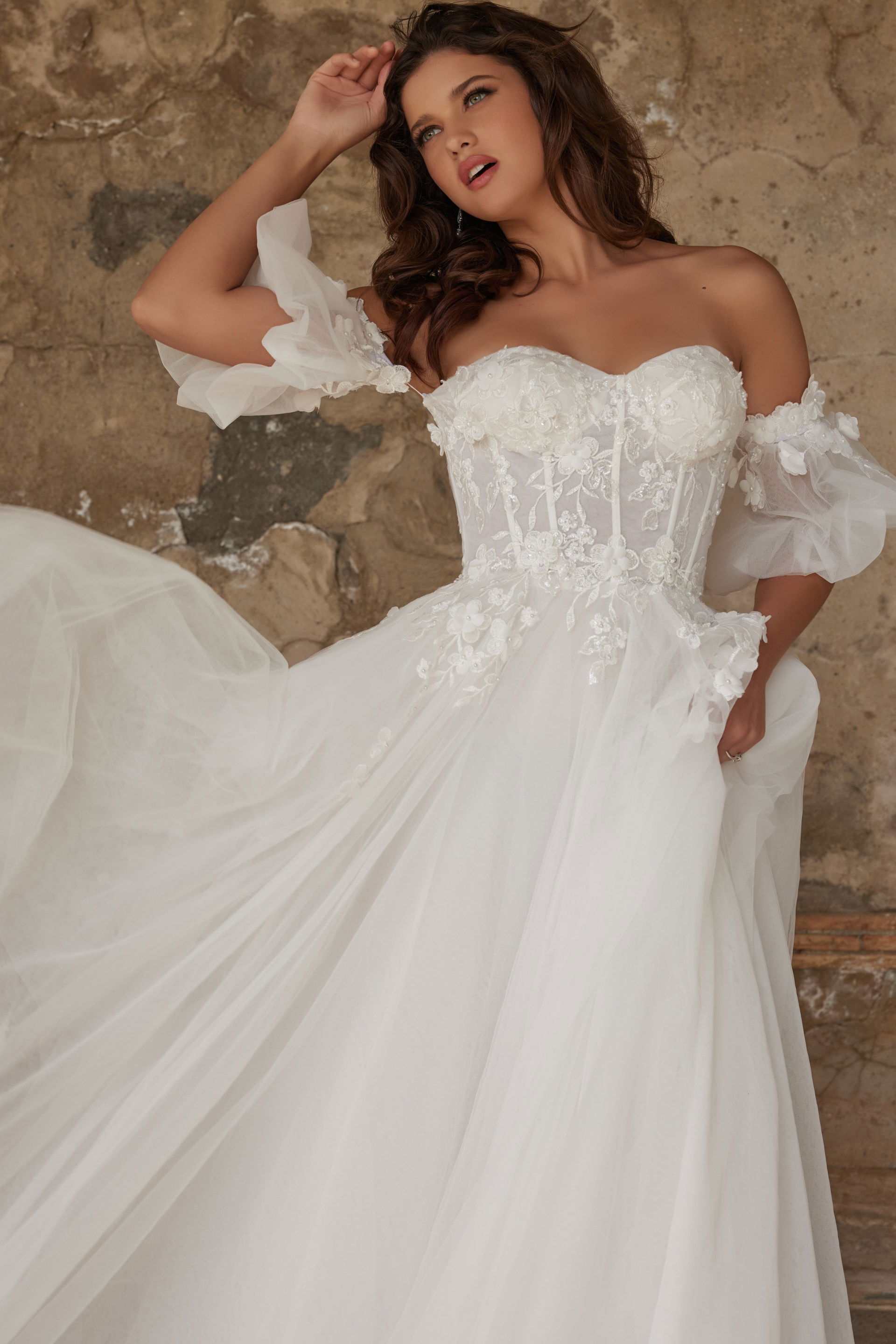 White Corset Bodice Ballgown JB23693. Embrace timeless elegance with this stunning white ballgown. Featuring a delicate corset bodice adorned with intricate floral appliqués, this dress exudes romance and sophistication. The floor-length tulle skirt flows gracefully, creating an enchanting A-line silhouette. Off-the-shoulder puff sleeves add a whimsical touch, while the exquisite pleated details enhance the ethereal charm. Ideal for a fairytale wedding or a grand evening gala, this gown is sure to make a lasting impression.