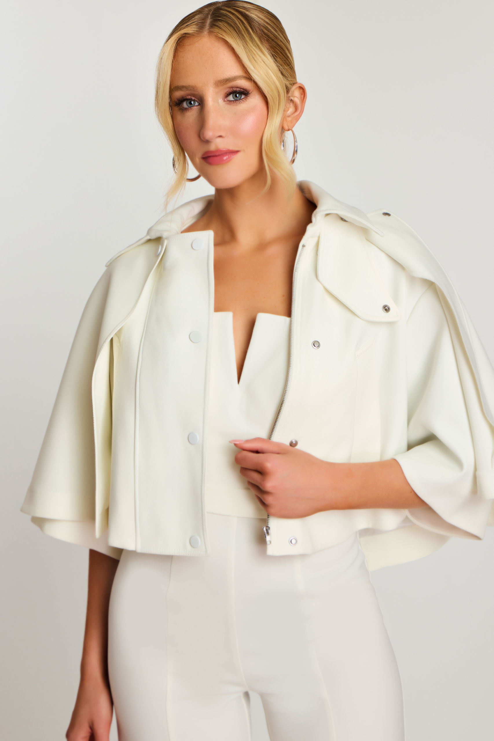 White Jumpsuit with V-Notch Neckline and Cape 46781