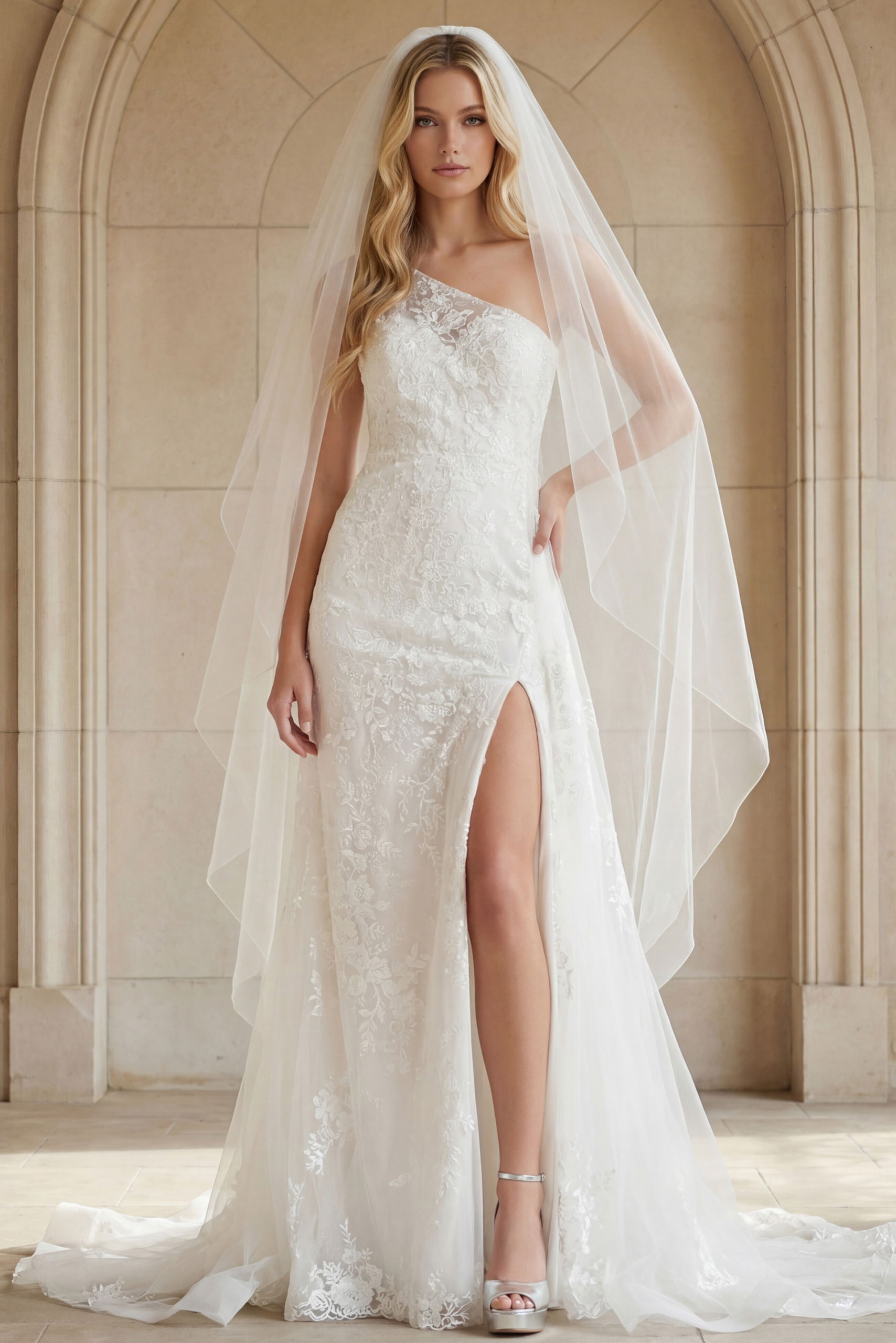 Introducing the exquisite White One Shoulder High Slit Bridal Dress JB37601. Crafted for the modern bride, this elegant dress embodies sophistication and grace. With its stunning one-shoulder neckline and enchanting lace fabric, it exudes a timeless charm. The floor-length sheath silhouette accentuates the natural curves, making it perfect for a grand entrance. The sheer back style adds a touch of allure, while the high slit detail brings a bold flair to the overall look. Designed with utmost care, this dress ensures you are the star of your special day.