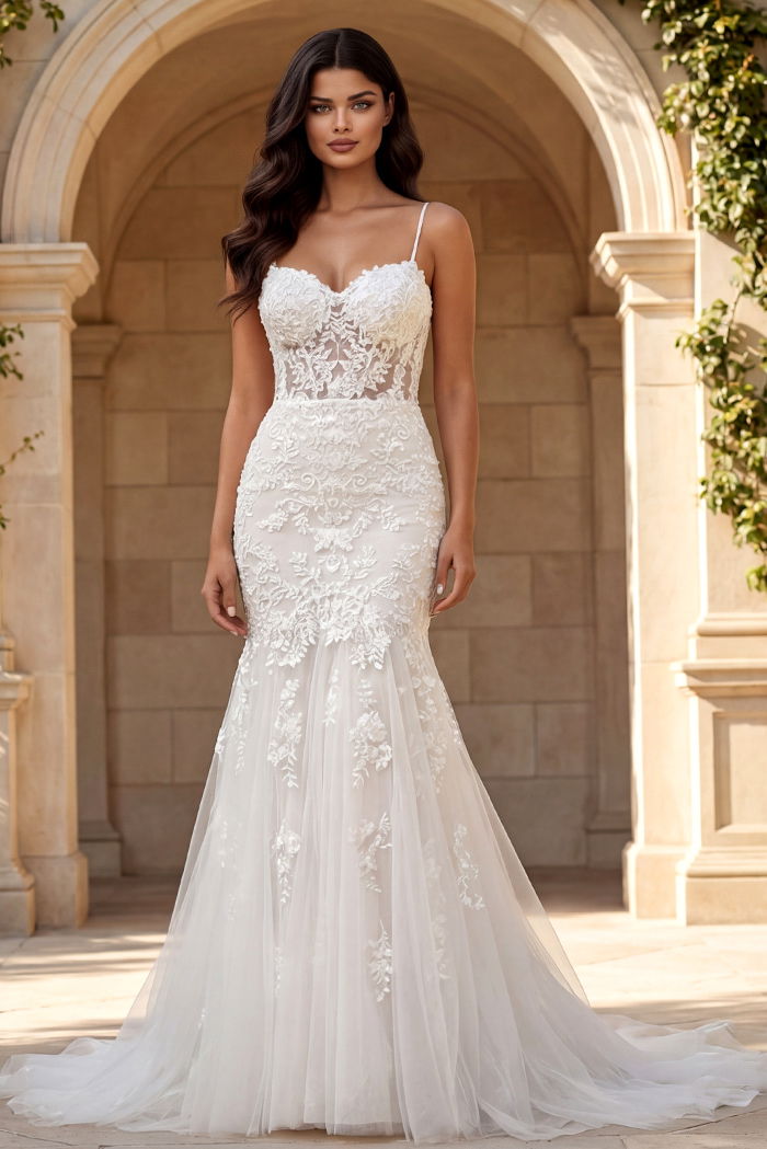 Elegant and timeless, this strapless mermaid gown features a stunning sheer beaded bodice and a long, flowing tulle skirt adorned with intricate lace appliqués. Designed in a classic off-white color, this gown offers a romantic silhouette that is fitted through the bodice and hips, flaring out beautifully at the knee. The sleeveless design with spaghetti straps adds a touch of delicate charm, making it the perfect choice for any special occasion.