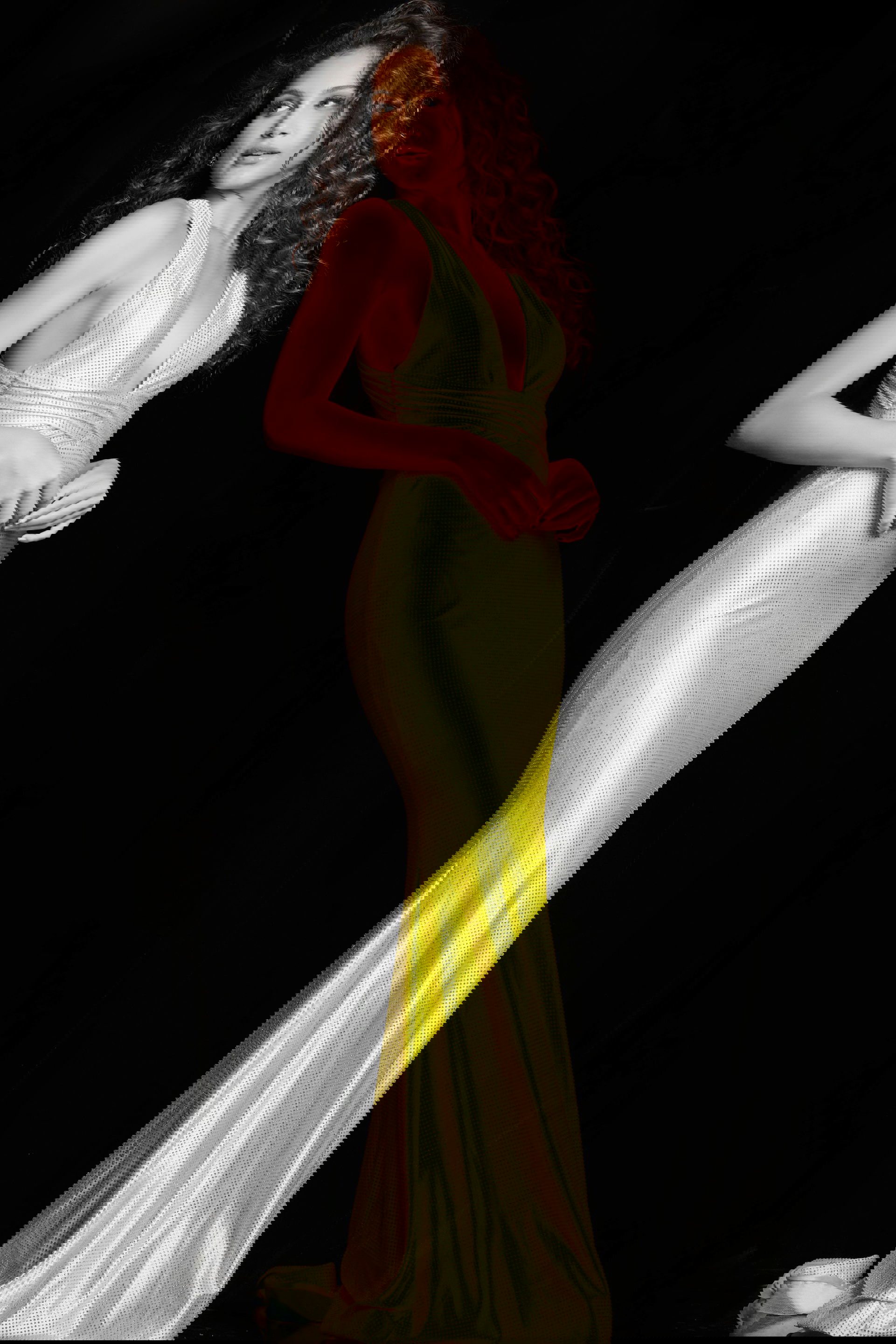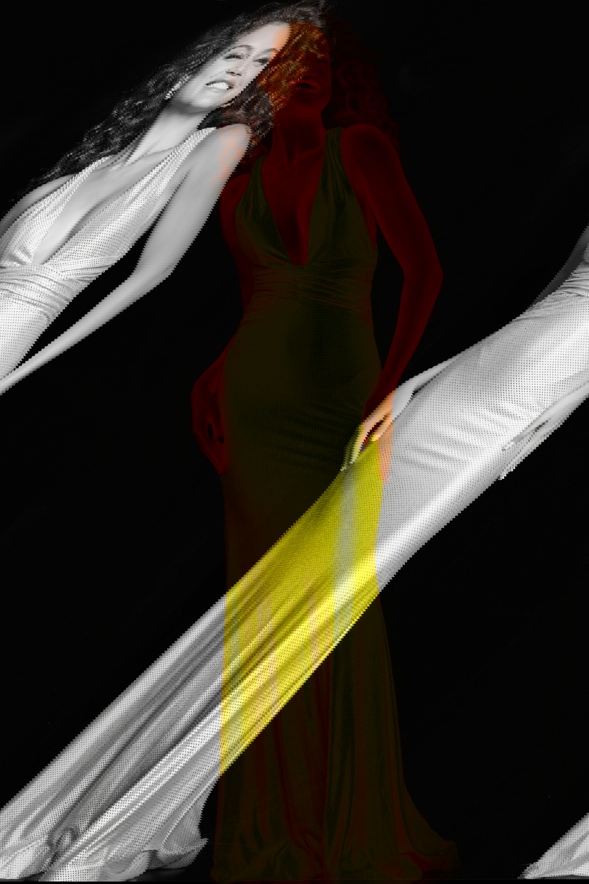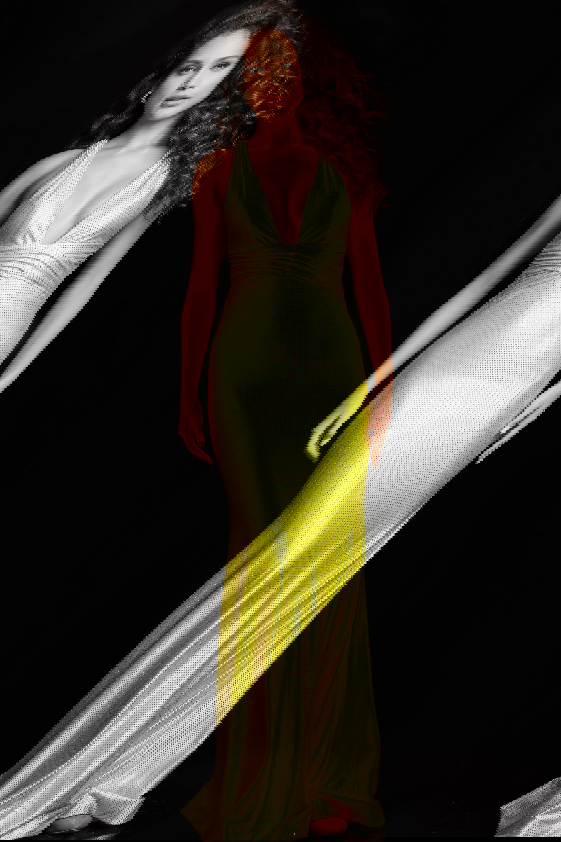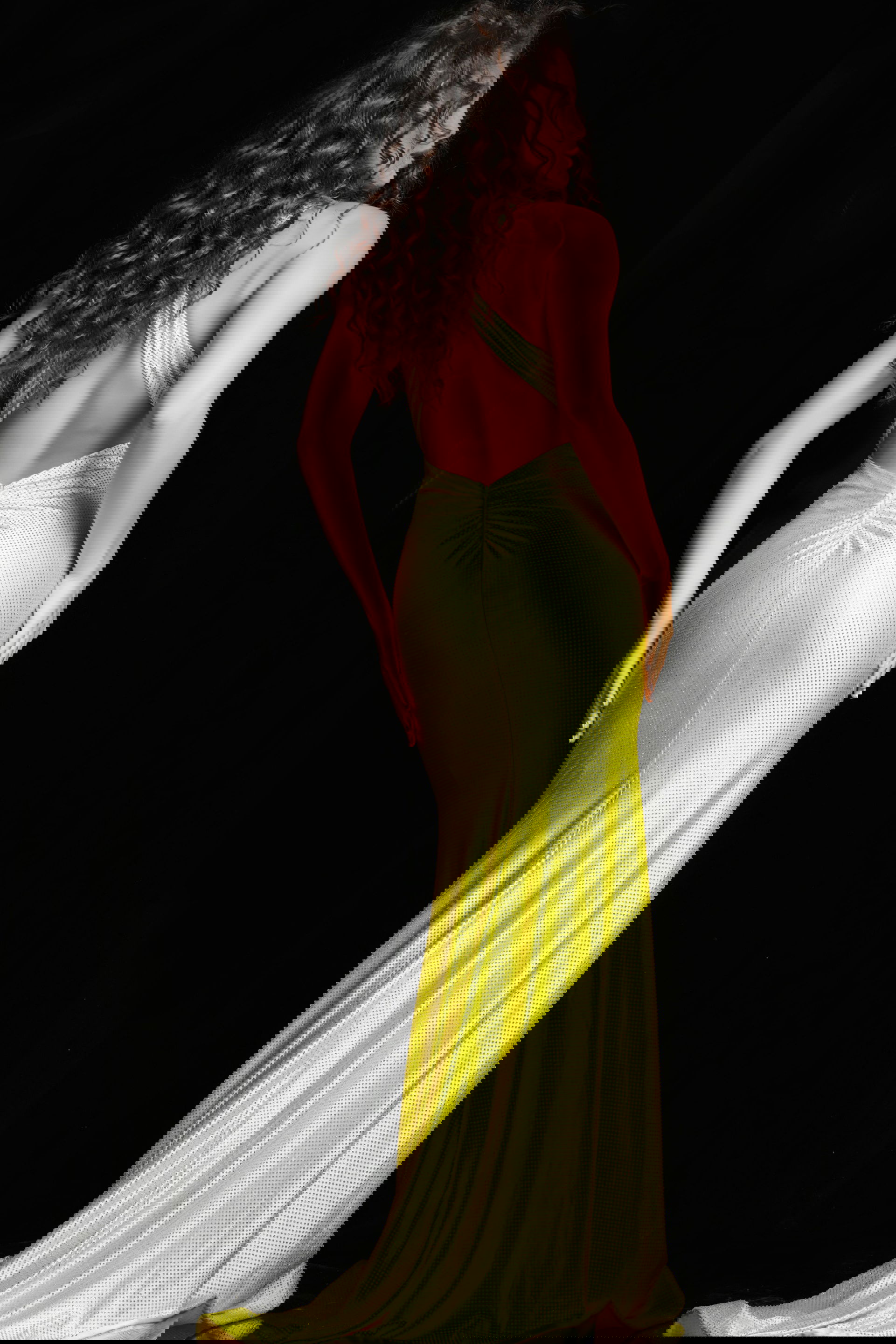The open back of the dress adds a sensual and alluring touch, while the low V neckline complements the overall design, creating a balance between sophistication and allure. The sleeveless design allows for ease of movement and showcases the shoulders and arms.